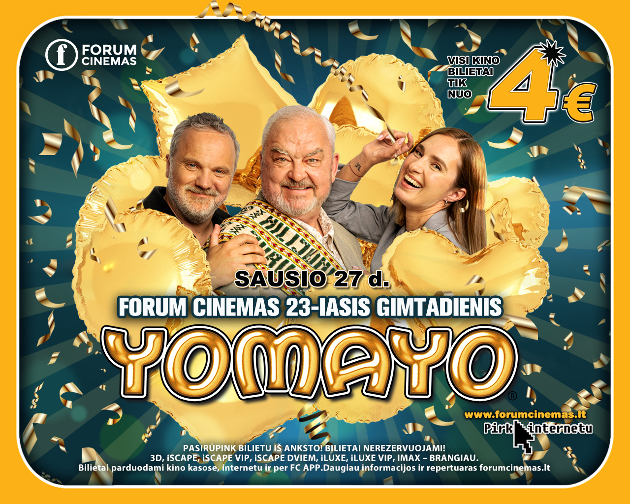 Tad švęskime YOMAYO GIMTADIENĮ kartu su iSCAPE, iLUXE ir IMAX maksimaliai – tik sausio 27 visi kino bilietai į visus kino filmus visą dieną ir nakčia visuose kino centruose „Forum Cinemas“ Vilniuje, Kaune, Klaipėdoje ir Šiauliuose kainuos tik nuo 4 eurų!